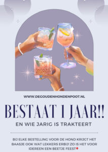 Wauw…. wat is het jaar weer voorbij gevlogen.. Zoveel gebeurd in zoon korte tijd. 1 april 2022 heb ik me aangemeld bij de kamer van koophandel om eindelijk die lang gekoesterde droom waar te gaan maken. En kijk een jaar later waar ik nu sta. Wat was het een jaar met veel ups en downs. Maar wel weer veel bereikt: Super dankbaar voor een mooie website, fantastische lieve volgers en klanten, met bijna mijn diploma op zak, goeie leveranciers en nieuwe leuke contacten gemaakt om in de toekomst zaken mee te doen. Bedrijven die mijn al benaderen voor de massages terwijl ik nog niet eens zo ver ben. Nog even de laatje lootjes voor het examen.. de finish is  al te zien. Zo dankbaar en blij voor al dat vertrouwen. Zonder jullie had ik dit niet gekund!!! Dus dankjulliewel allemaal!! Kijk ik uit naar een onwijs mooie toekomst. Samen met jullie. Maar wie jarig is trakteert. Bij elke bestelling voor de hond krijgt het baasje ook wat lekkers. Zo is het voor iedereen een beetje feest! ACTIE GELD TOT 7 APRIL 2023. EN DAN OP MET ZIJN ALLE NAAR EEN PRACHTIGE TOEKOMST. Waarmee ik heel veel hondjes mag en kan helpen. En owja vergeet je onze paasbest actie ook niet? Stuur een leuke feestelijke foto van je hond en wie weet maak ik jou hond wel blij met een verwen/paaspakket. Actie stopt 6 april 2023 19.00 uur. paasbest actie degoudenhondenpoot